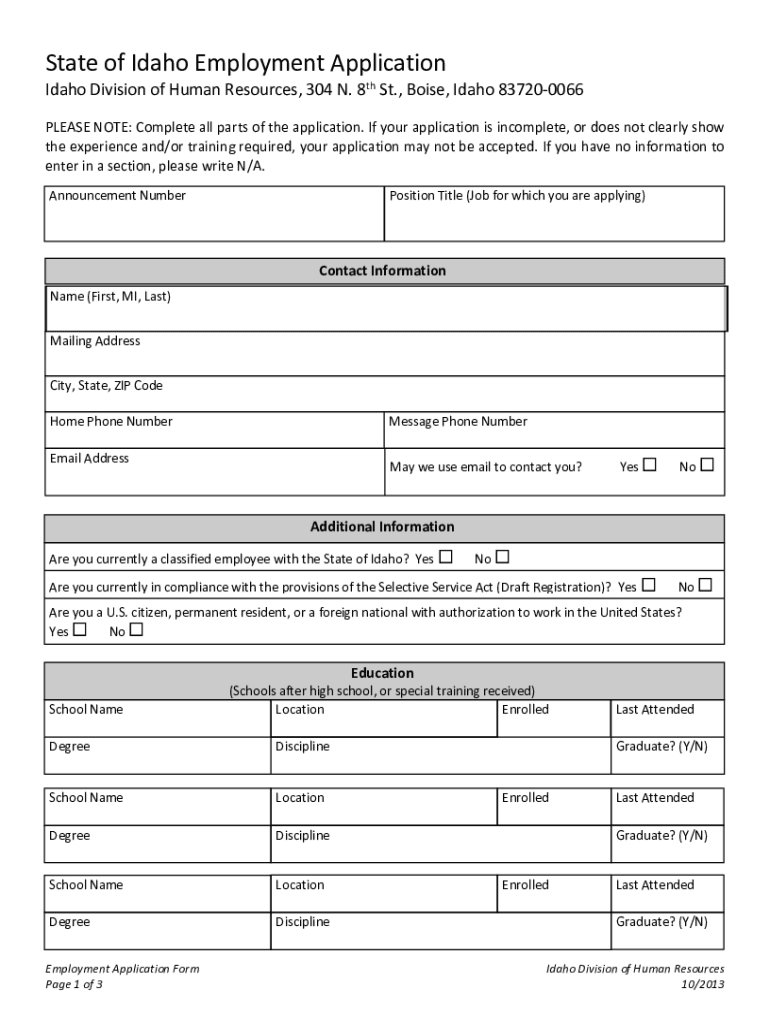 State of Idaho Employment Application Idaho Division of Human Resources, 304 N. 8th St., Boise, Idaho 837200066 PLEASE NOTE: Complete all parts of the application. If your application is incomplete,