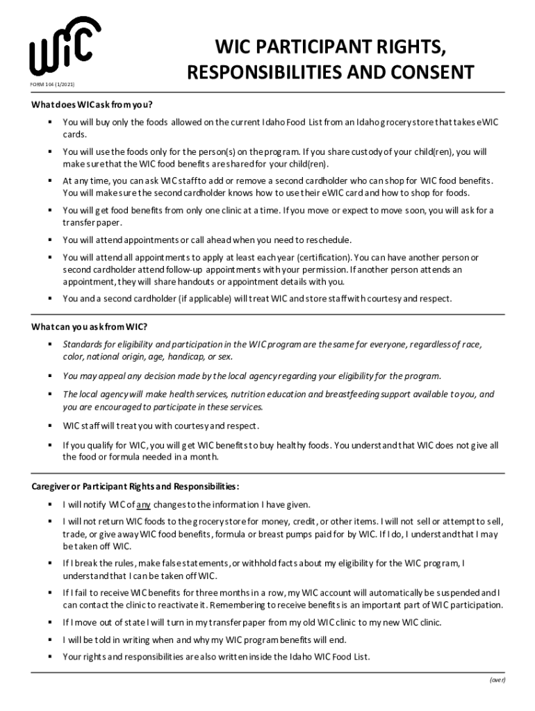FORM 104 (1/2021)WIC PARTICIPANT RIGHTS, RESPONSIBILITIES AND CONSENTWhat does WIC ask from you? You will buy only the foods allowed on the current Idaho Food List from an Idaho grocery store that