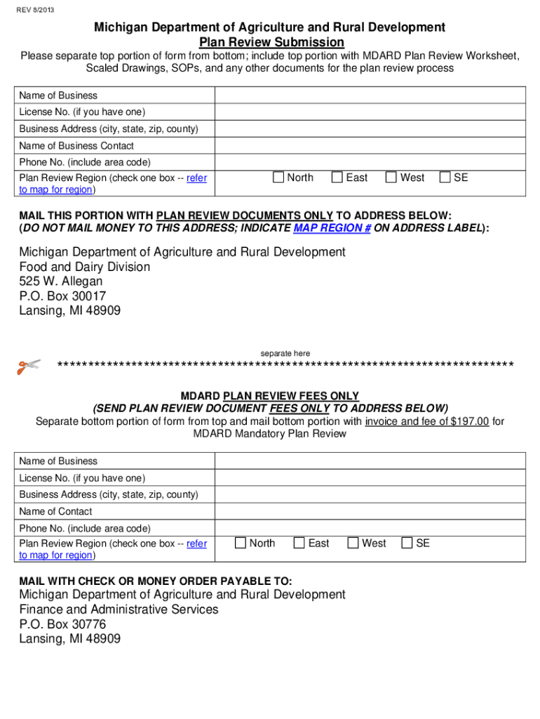 REV 8/2013Michigan Department of Agriculture and Rural Development Plan Review Submission Please separate top portion of form from bottom; include top portion with MDRD Plan Review Worksheet, Scaled
