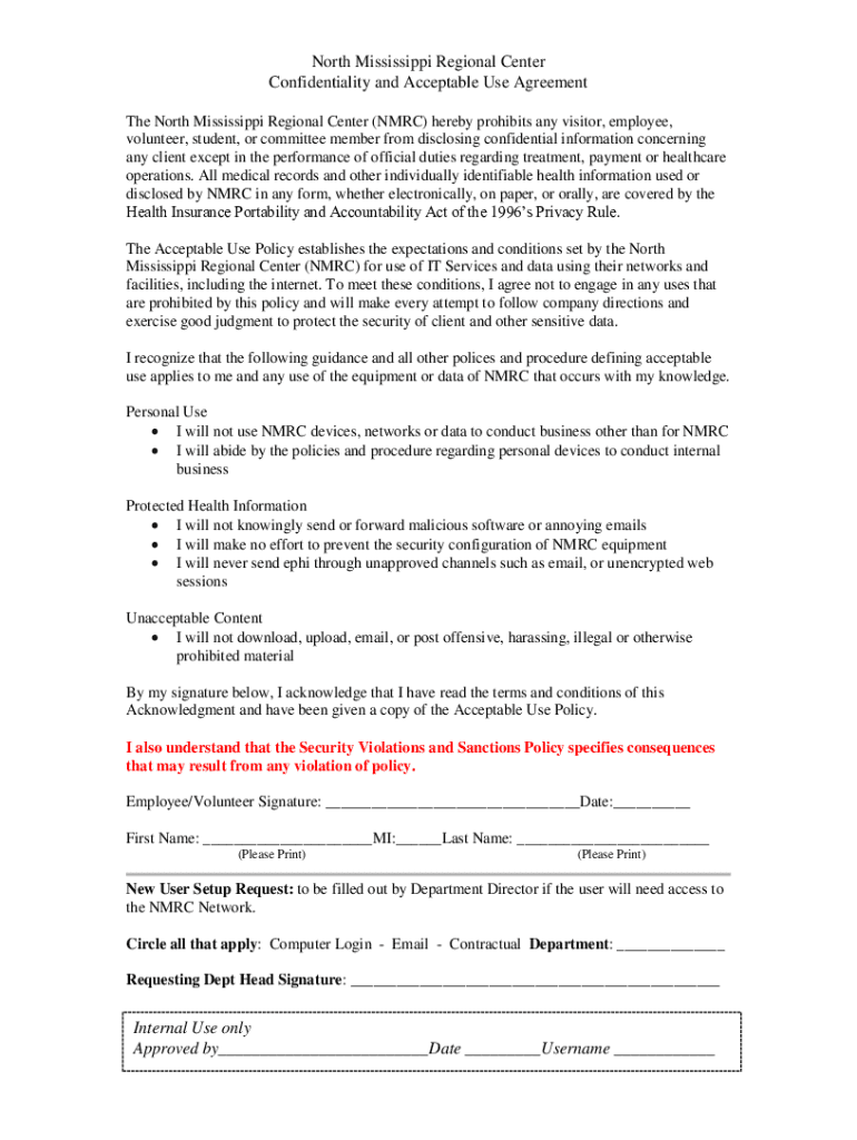 North Mississippi Regional Center Confidentiality and Acceptable Use Agreement The North Mississippi Regional Center (NMR) hereby prohibits any visitor, employee, volunteer, student, or committee