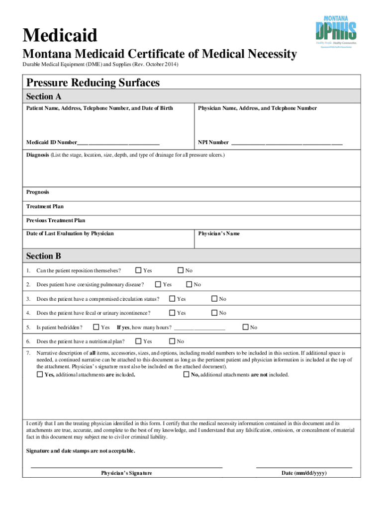 Medicaid Montana Medicaid Certificate of Medical Necessity Durable Medical Equipment (DME) and Supplies (Rev. October 2014)Pressure Reducing Surfaces Section A Patient Name, Address, Telephone Number,