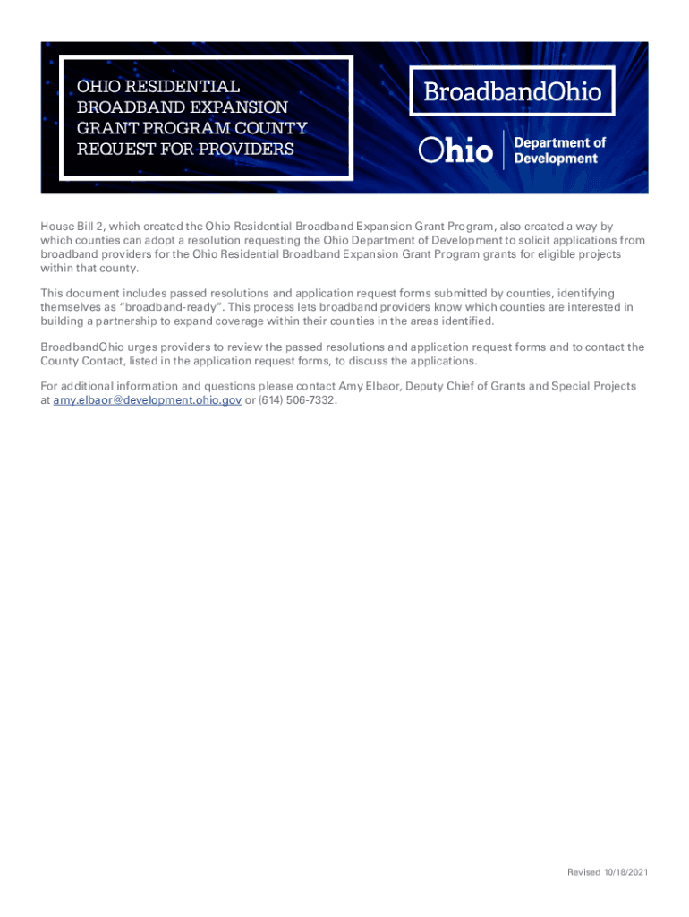 OHIO RESIDENTIAL BROADBAND EXPANSION GRANT PROGRAM COUNTY REQUEST FOR PROVIDERS House Bill 2, which created the Ohio Residential Broadband Expansion Grant Program, also created a way by which counties