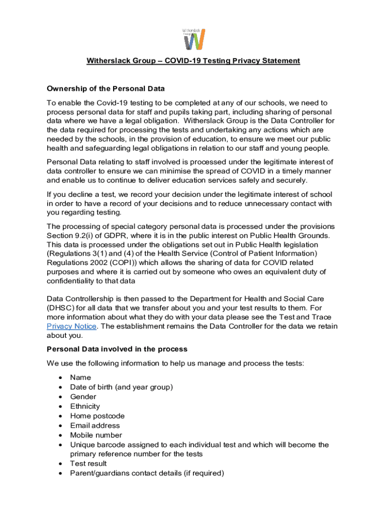 Wither slack Group COVID-19 Testing Privacy Statement Ownership of the Personal Data To enable the COVID-19 testing to be completed at any of our schools, we need to process personal data for staff
