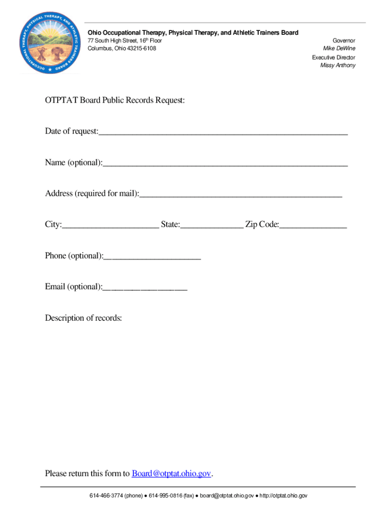 Ohio Occupational Therapy, Physical Therapy, and Athletic Trainers Board 77 South High Street, 16th Floor Columbus, Ohio 432156108Governor Mike DeWine Executive Director Missy AnthonyOTPTAT Board