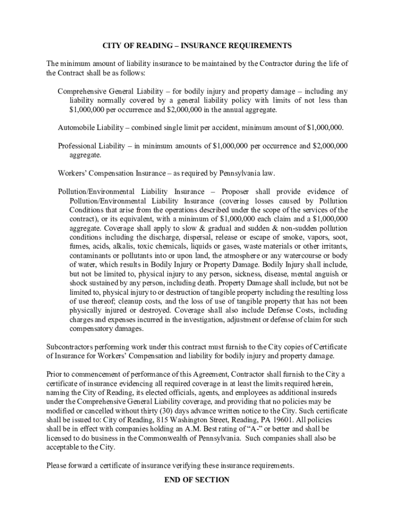 CITY OF READING INSURANCE REQUIREMENTS The minimum amount of liability insurance to be maintained by the Contractor during the life of the Contract shall be as follows: Comprehensive General Liability