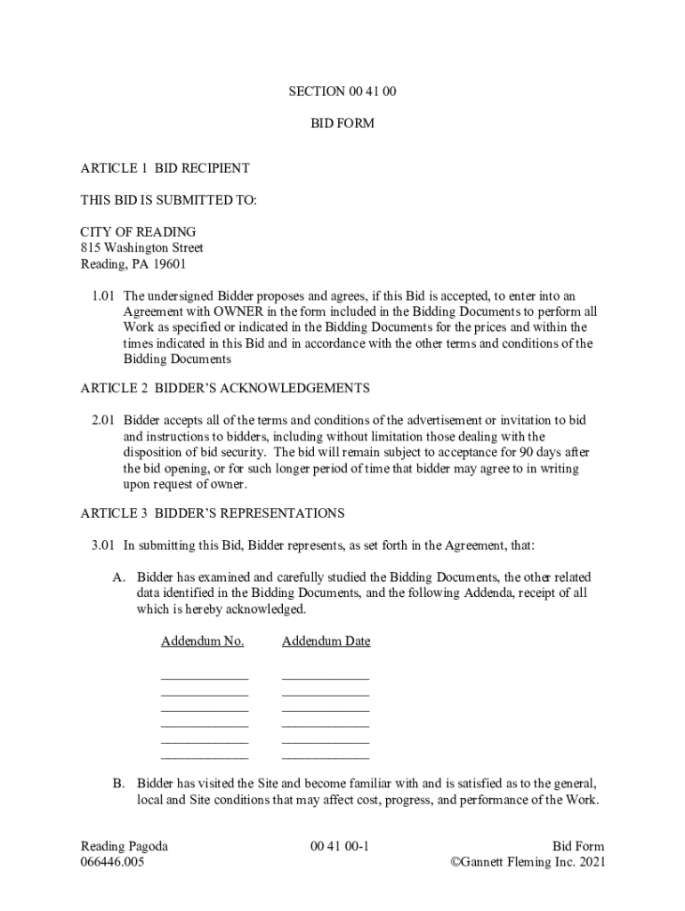 SECTION 00 41 00 BID FORM ARTICLE 1 BID RECIPIENT THIS BID IS SUBMITTED TO: CITY OF READING 815 Washington Street Reading, PA 19601 1.01 The undersigned Bidder proposes and agrees, if this Bid is
