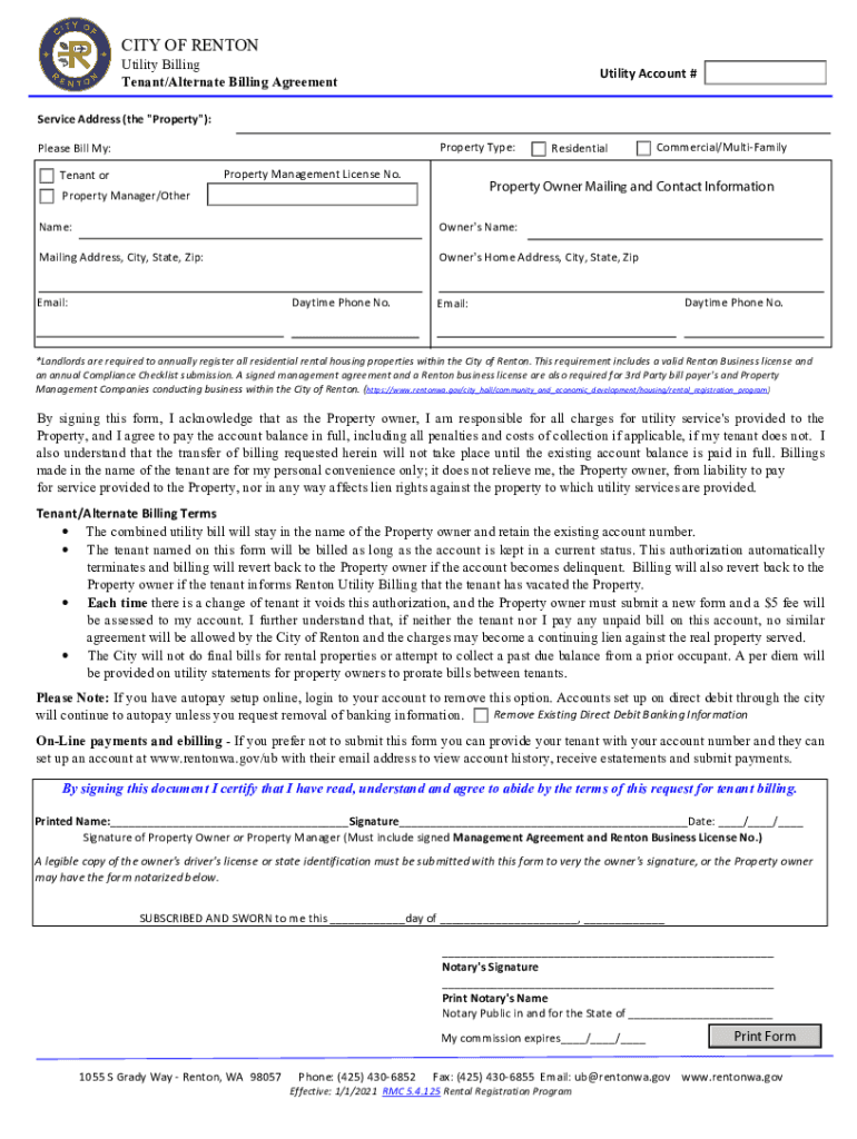 CITY OF RENTONUtility Billing Tenant/Alternate Billing AgreementUtility Account #Service Address (the Property “): Property Type:Please Bill My: Property Management License No. Tenant orResidentialProperty