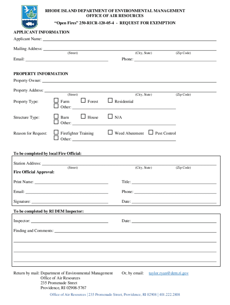 RHODE ISLAND DEPARTMENT OF ENVIRONMENTAL MANAGEMENT OFFICE OF AIR RESOURCES Open Fires 250RICR120054 REQUEST FOR Exemption requirements of Open Fires 250RICR120054 (Part 4) can be found in its entirety