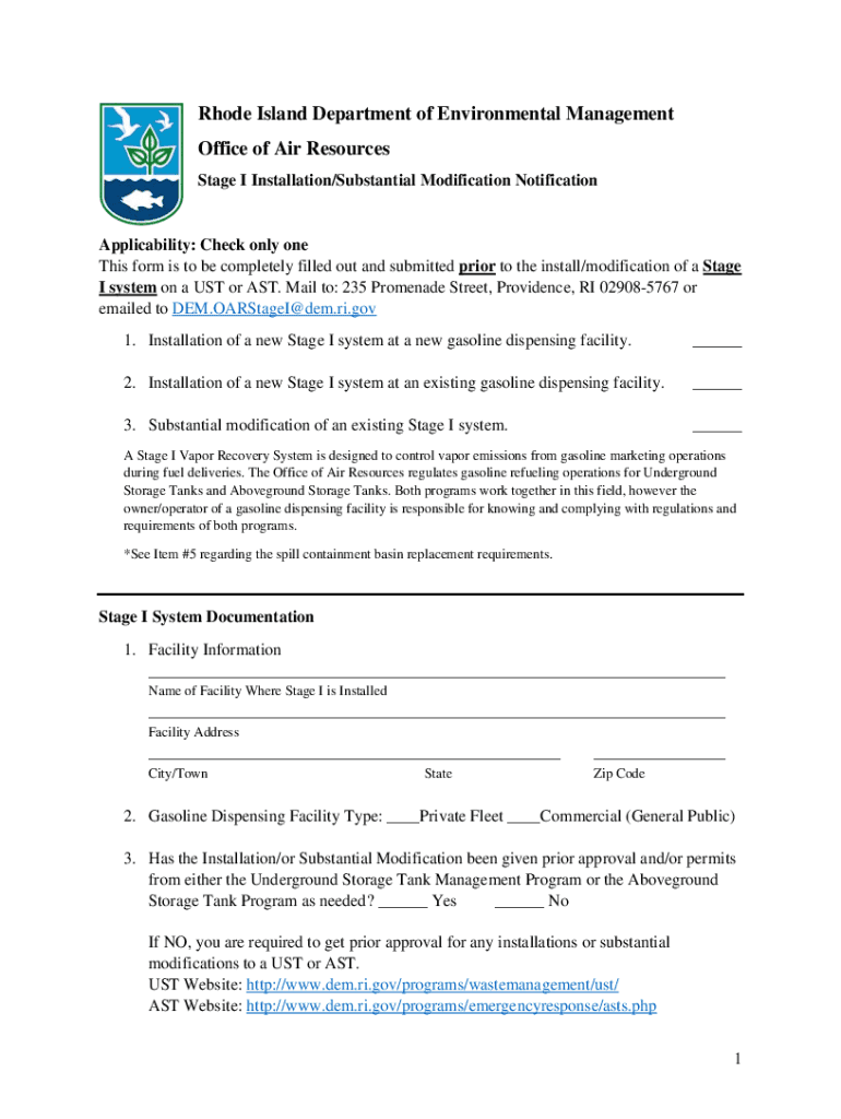Rhode Island Department of Environmental Management Office of Air Resources Stage I Installation/Substantial Modification NotificationApplicability: Check only one This form is to be completely filled
