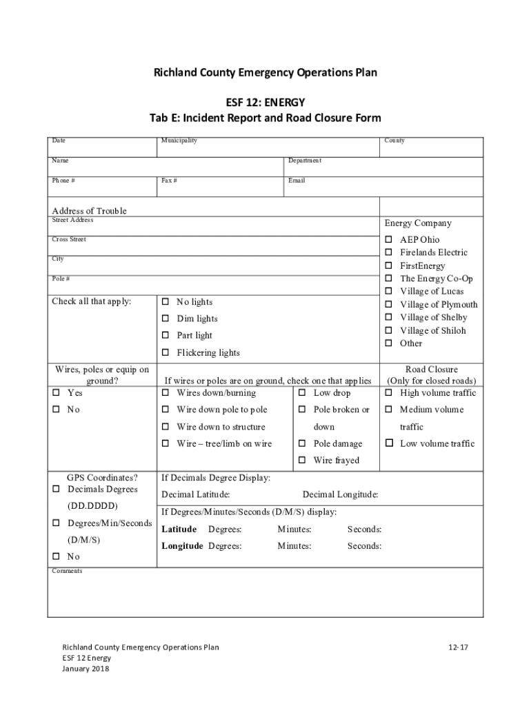 Richland County Emergency Operations Planes 12: Energy E: Incident Report and Road Closure FormDateMunicipalityCountyName Phone #Department Fax #Misaddress of Trouble Street AddressEnergy Company