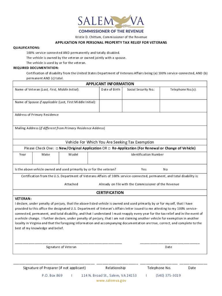Kristie D. Chit tum, Commissioner of the RevenueAPPLICATION FOR PERSONAL PROPERTY TAX RELIEF FOR VETERANS QUALIFICATIONS: 100% service connected AND permanently and totally disabled. The vehicle is