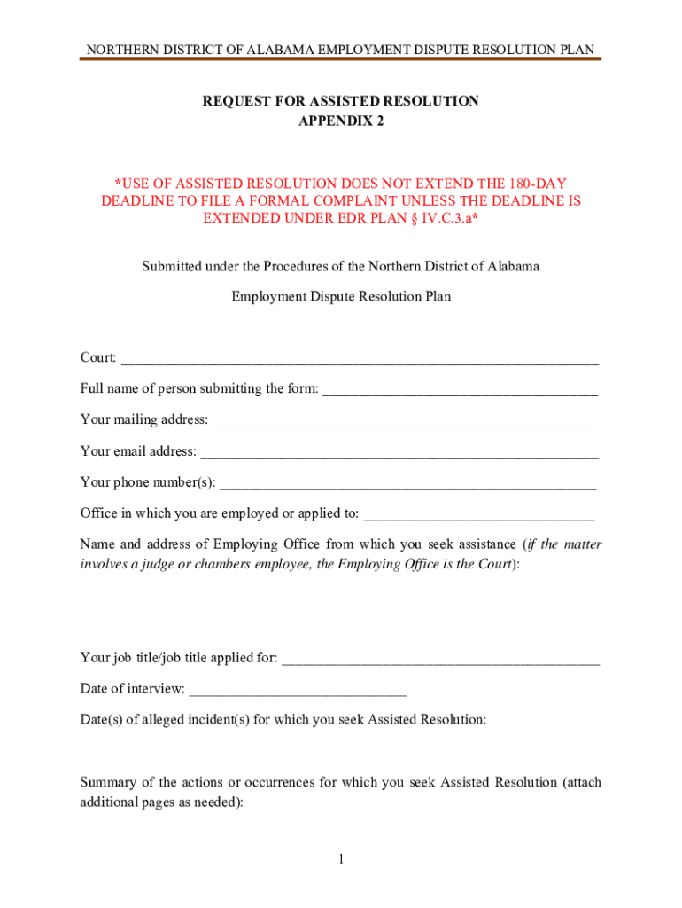 NORTHERN DISTRICT OF ALABAMA EMPLOYMENT DISPUTE RESOLUTION PLANREQUEST FOR ASSISTED RESOLUTION APPENDIX 2 USE OF ASSISTED RESOLUTION DOES NOT EXTEND THE 180DAY DEADLINE TO FILE A FORMAL COMPLAINT