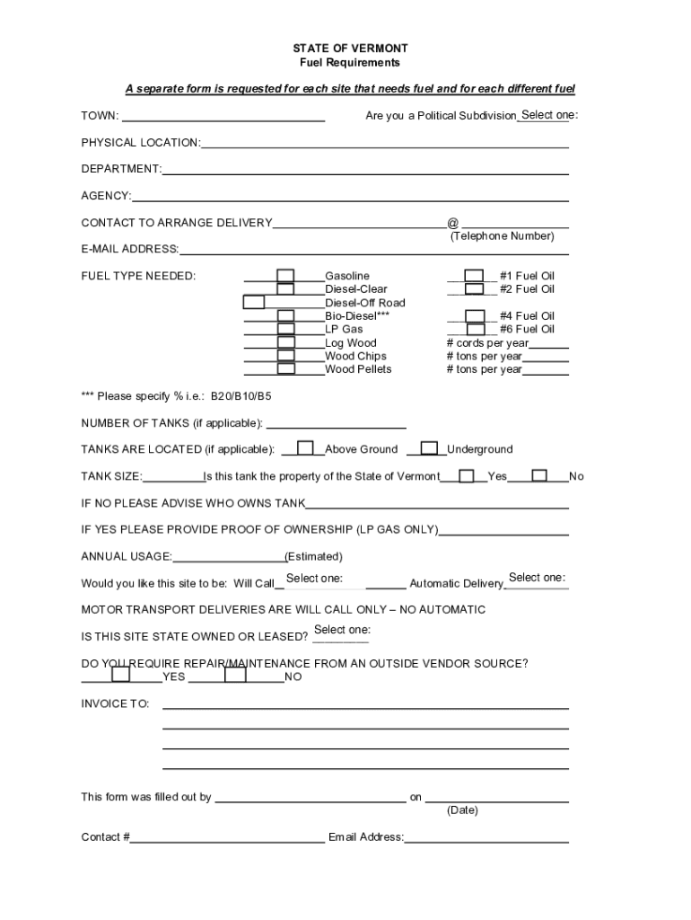 STATE OF VERMONT Fuel Requirements A separate form is requested for each site that needs fuel and for each different fuel TOWN:Are you a Political Subdivision Select one:PHYSICAL LOCATION: DEPARTMENT: