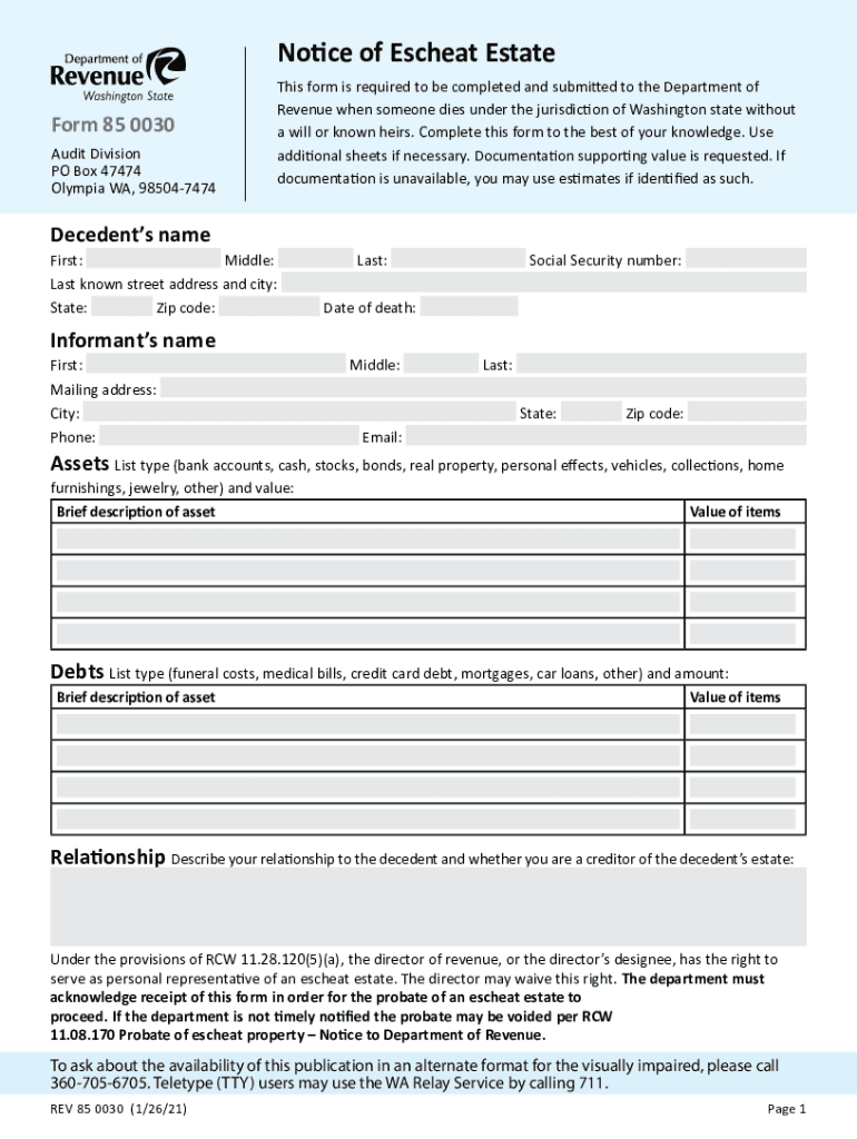 Get the free Notice of Escheat Estate - Washington Department of Revenue - dor wa