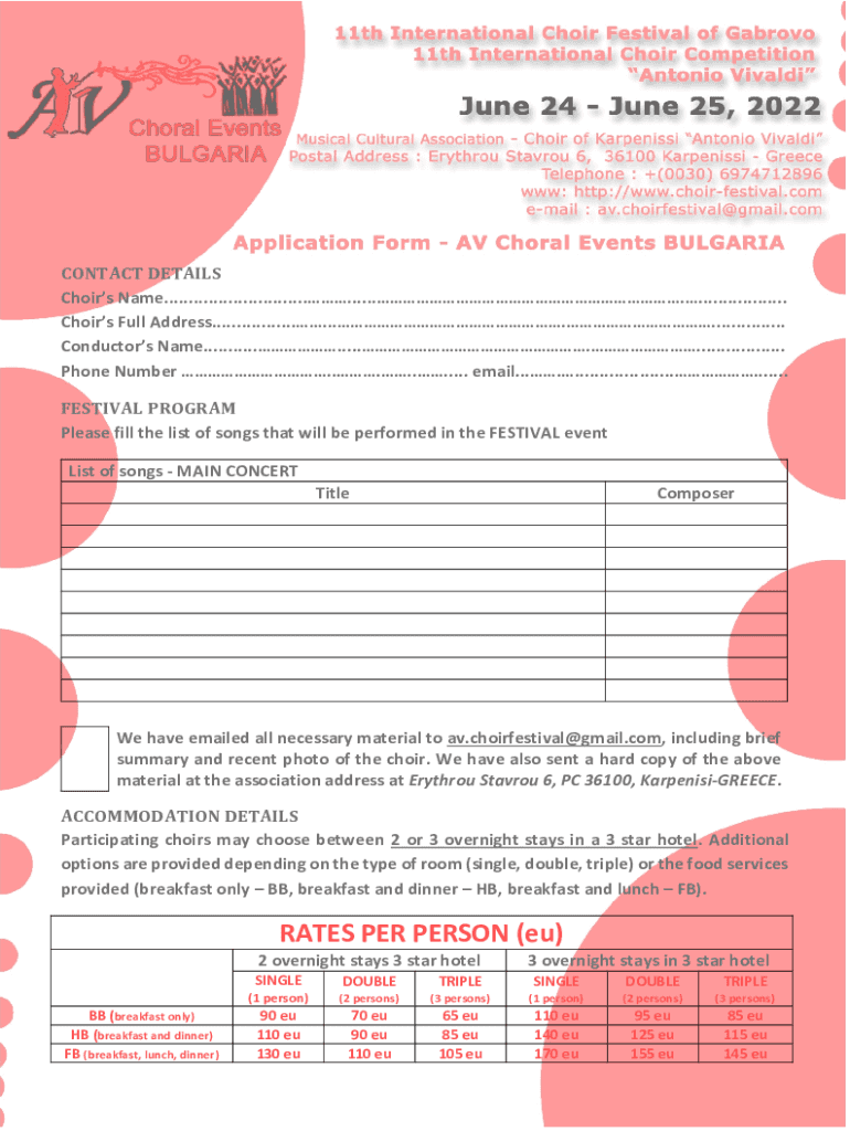 CONTACT DETAILS Choirs Name...................................................... Choirs Full Address.................................... Conductors Name................................... Phone Number.