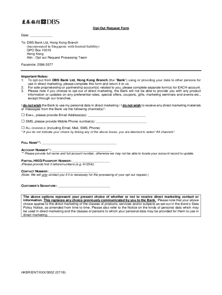 Opt-out Request Form Date: To: DBS Bank Ltd, Hong Kong Branch(incorporated in Singapore with limited liability) GPO Box 10015 Hong Kong Attn : Opt out Request Processing Team Facsimile: 2596 0577Important