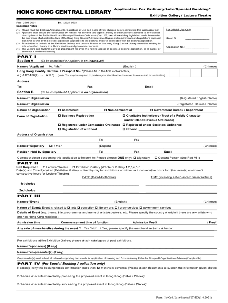 HONG KONG CENTRAL LIBRARY Fax : 2504 2091 Important Notes :Application For Ordinary/Late/Special Booking *Exhibition Gallery/ Lecture Theatrical. 2921 0503 For Official Use Only(1) Please read the