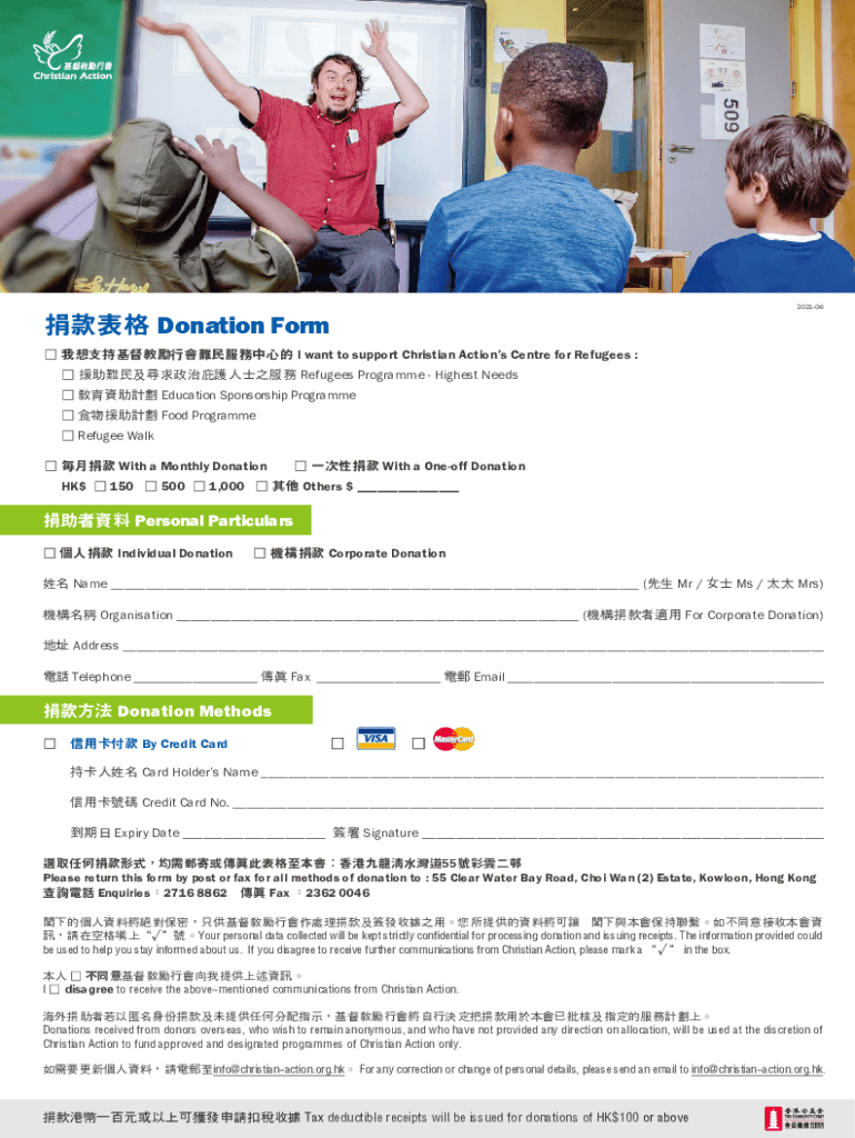 Donation Form202106 I want to support Christian Actions Center for Refugees : Refugees Program The Highest Needs Education Sponsorship Program Food Program Refugee Walks With a Monthly Donation With