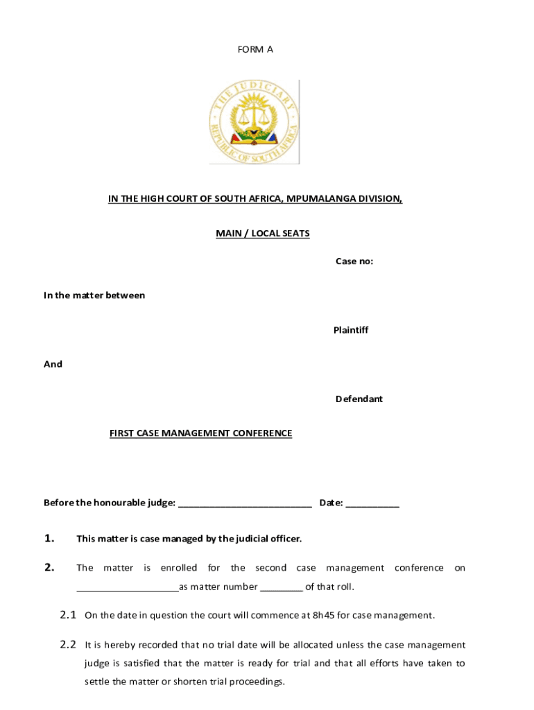 FORM AIN THE HIGH COURT OF SOUTH AFRICA, MPUMALANGA DIVISION, MAIN / LOCAL SEATS Case no: In the matter between Plaintiff And Defendant FIRST CASE MANAGEMENT CONFERENCEBefore the honorable judge: