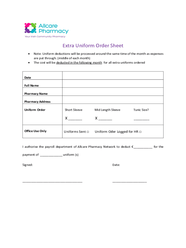Extra Uniform Order Sheet Note: Uniform deductions will be processed around the same time of the month as expenses are put through. (middle of each month) The cost will be deducted in the following