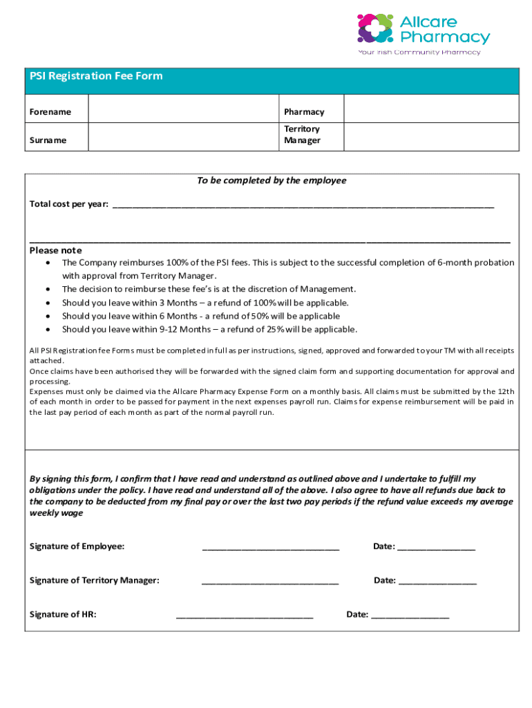 PSI Registration Fee Form ForenamePharmacySurnameTerritory Manager be completed by the employee Total cost per year: Please note The Company reimburses 100% of the PSI fees. This is subject to the