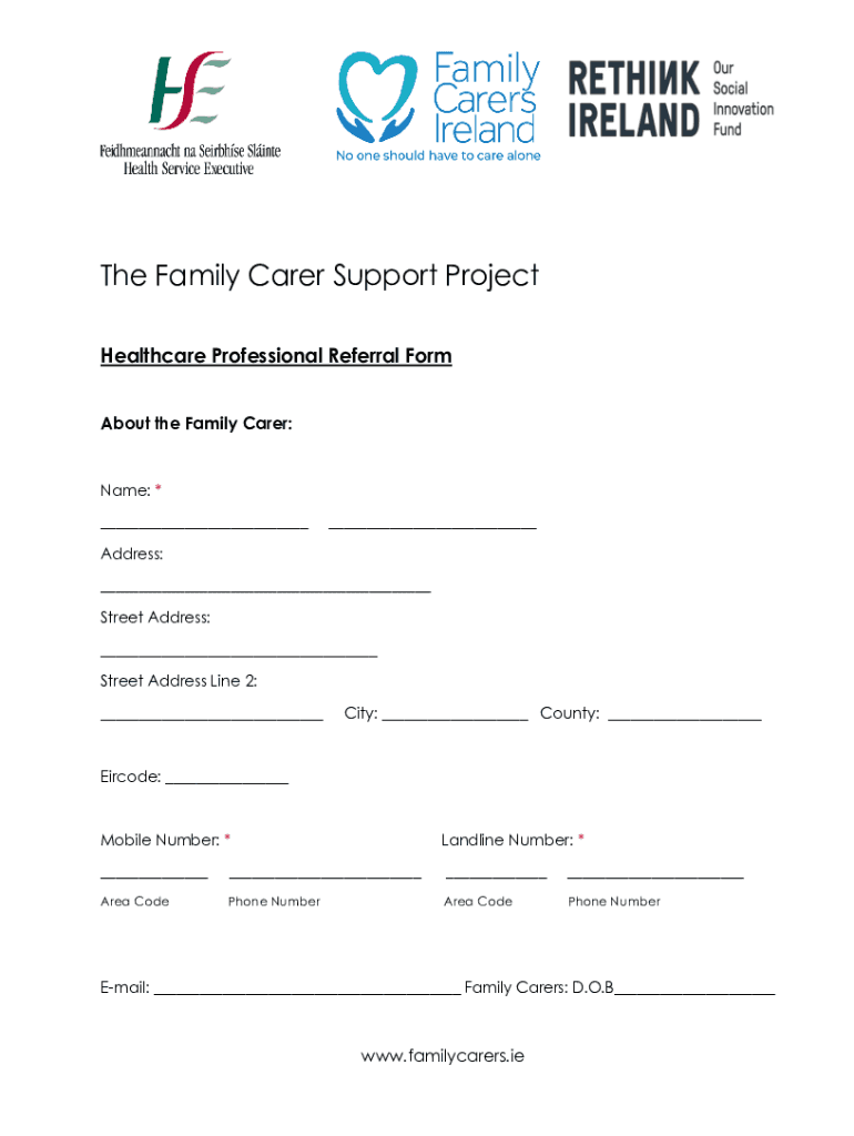 The Family Carer Support Project Healthcare Professional Referral Form About the Family Carer:Name: * Address: Street Address: Street Address Line 2: City: County: Encode: Mobile Number: *Landline