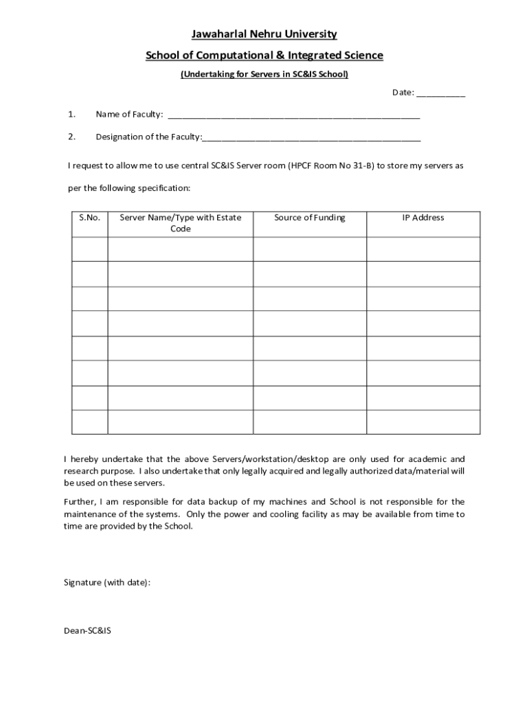 Jawaharlal Nehru University School of Computational & Integrated Science (Undertaking for Servers in SCOTS School) Date: 1. Name of Faculty: 2. Designation of the Faculty: I request to allow me to