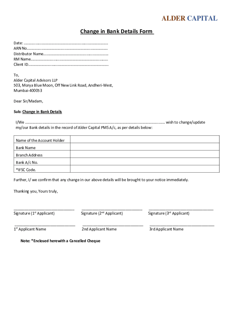 ALDER CAPITAL Change in Bank Details Form Date:. ARN No Distributor Name. RM Name Client ID To, Alder.