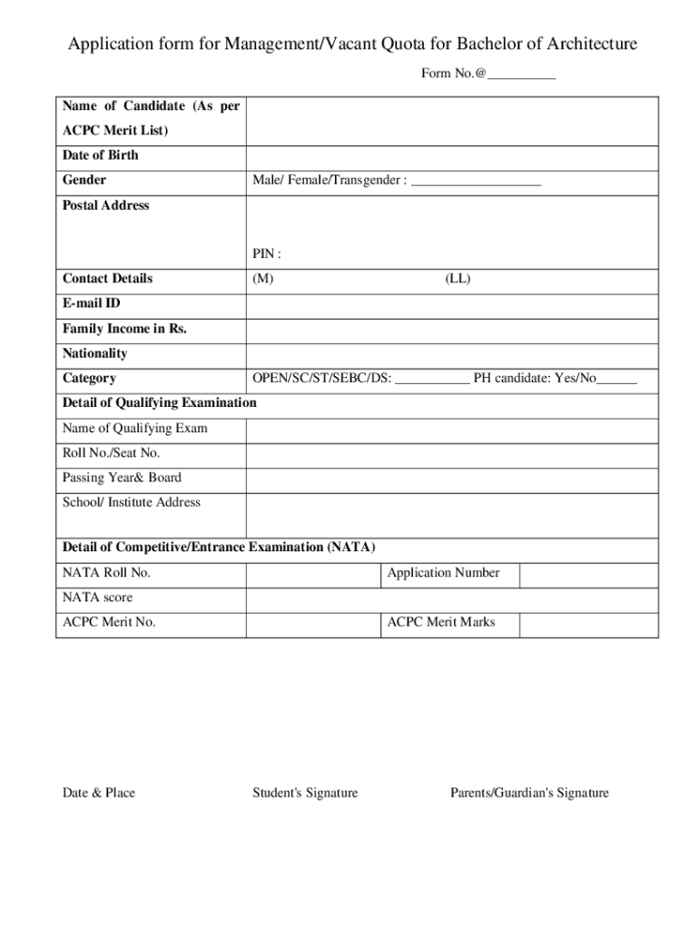 Application form for Management/Vacant Quota for Bachelor of Architecture Form No. Name of Candidate (As per APC Merit List) Date of Birth Gender Male/ Female/Transgender : Postal Address PIN : Contact