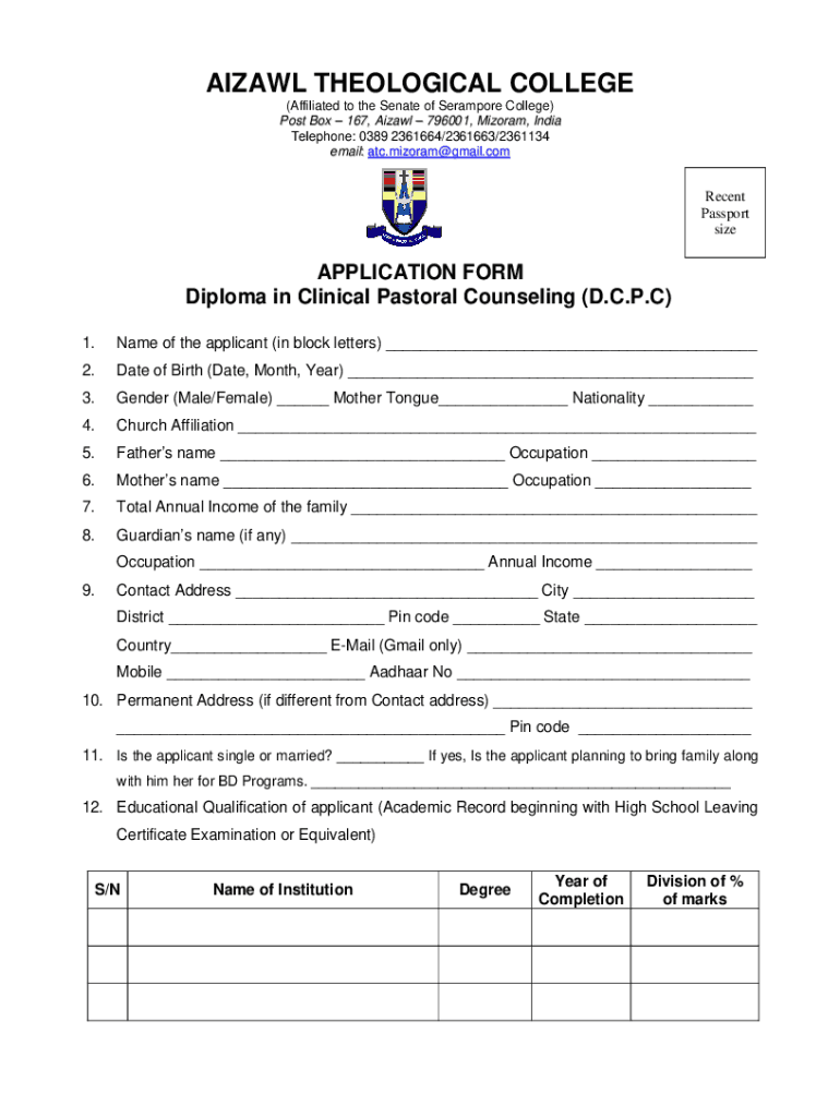 RIZAL THEOLOGICAL COLLEGE (Affiliated to the Senate of Seaport College) Post Box 167, Rizal 796001, Mizoram, India Telephone: 0389 2361664/2361663/2361134 email: ATC. Mizoram Gmail. Competent Passport