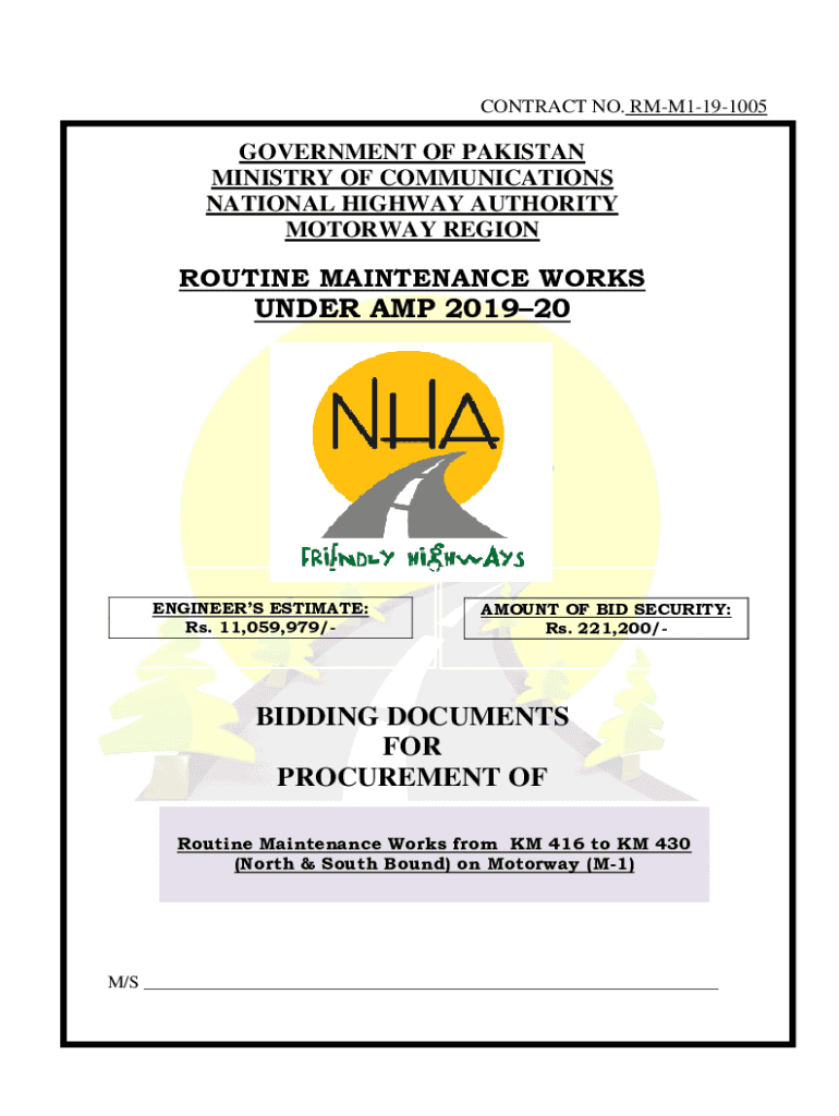 CONTRACT NO. RMM1191005GOVERNMENT OF PAKISTAN MINISTRY OF COMMUNICATIONS NATIONAL HIGHWAY AUTHORITY FREEWAY REGIONROUTINE MAINTENANCE WOUNDER AMP 201920ENGINEERS ESTIMATE: Rs. 11,059,979/AMOUNT OF