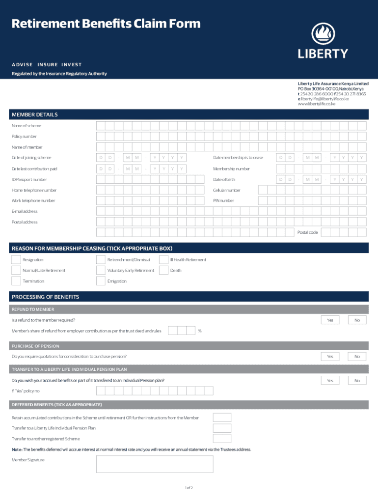 Retirement Benefits Claim Form ADVISEINSURE INVESTLiberty Life Assurance Kenya Limited t 254 20 286 6000 f 254 20 271 8365 e libertylife@libertylife.co.ke www.libertylife.co.keMEMBER DETAILS Name