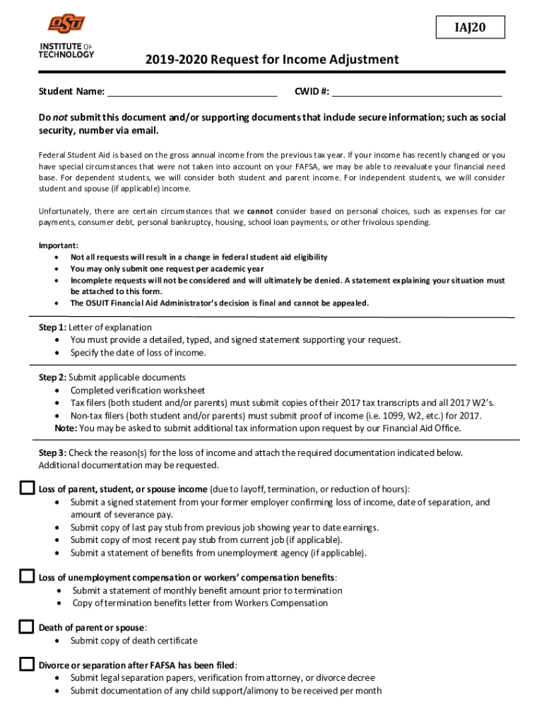 IAJ20 INSTITUTE OF TECHNOLOGY20192020 Request for Income AdjustmentStudent Name: CID #: Do not submit this document and/or supporting documents that include secure information; such as social security,