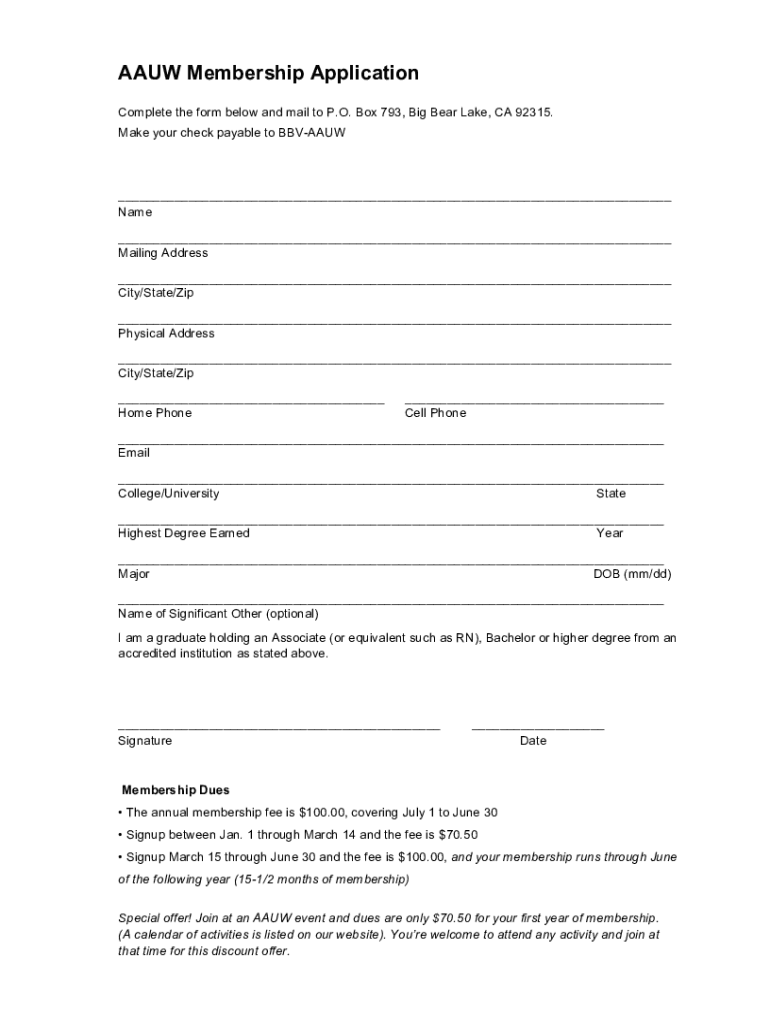 AAU Membership Application Complete the form below and mail to P.O. Box 793, Big Bear Lake, CA 92315. Make your check payable to BBVA AUW Name Mailing Address City/State/Zip Physical Address City/State/Zip