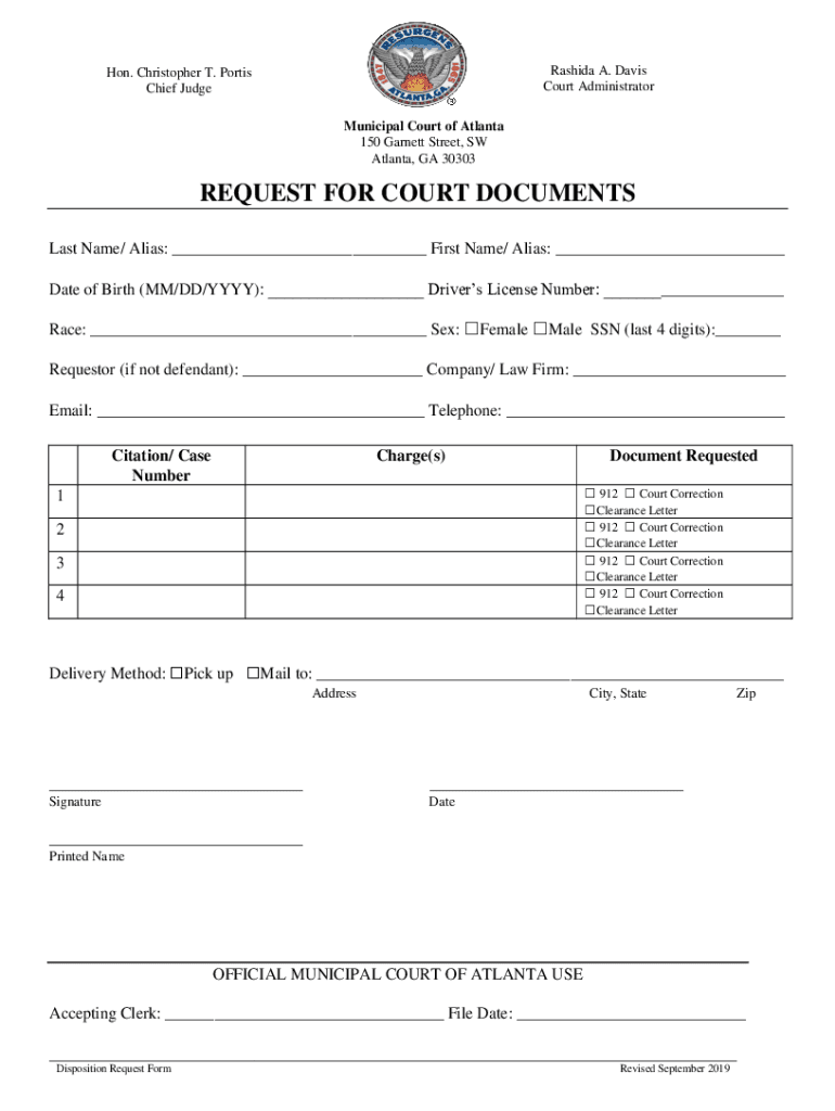Rashida A. Davis Court Administrator Hon. Christopher T. Ports Chief Judge Municipal Court of Atlanta 150 Garrett Street, SW Atlanta, GA 30303REQUEST FOR COURT DOCUMENTS Last Name/ Alias: First Name/