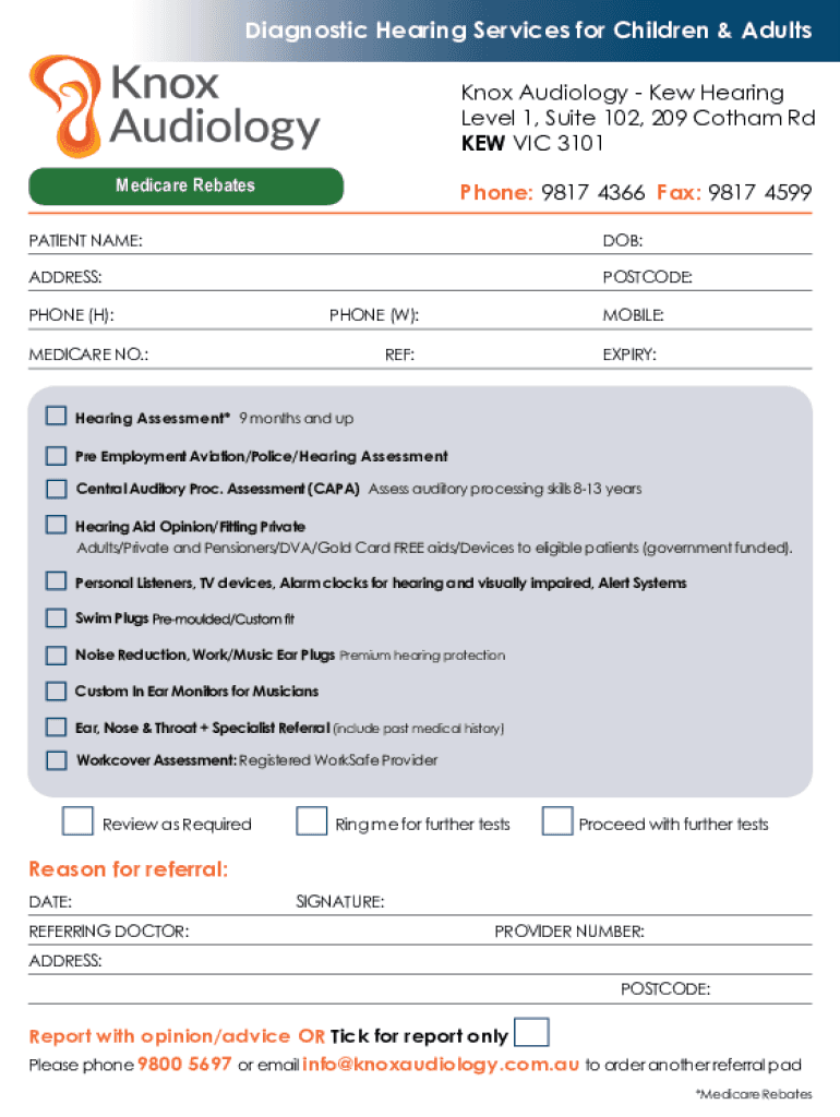 Diagnostic Hearing Services for Children & Adults Knox Audiology New Hearing Level 1, Suite 102, 209 Gotham Rd NEW VIC 3101 Medicare RebatesPhone: 9817 4366 Fax: 9817 4599PATIENT NAME:DOB:ADDRESS:POSTCODE: