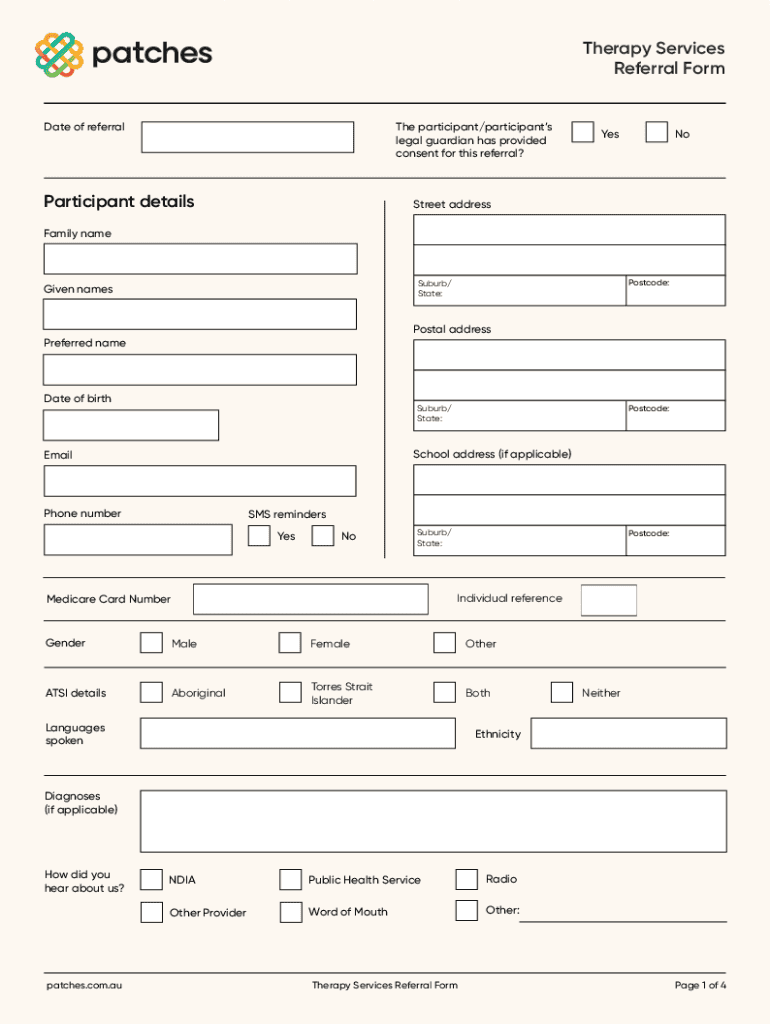Therapy Services Referral Form The participant/participants legal guardian has provided consent for this referral? Date of referralParticipant detailsYesNoStreet addressFamily namePostcode:Suburb/