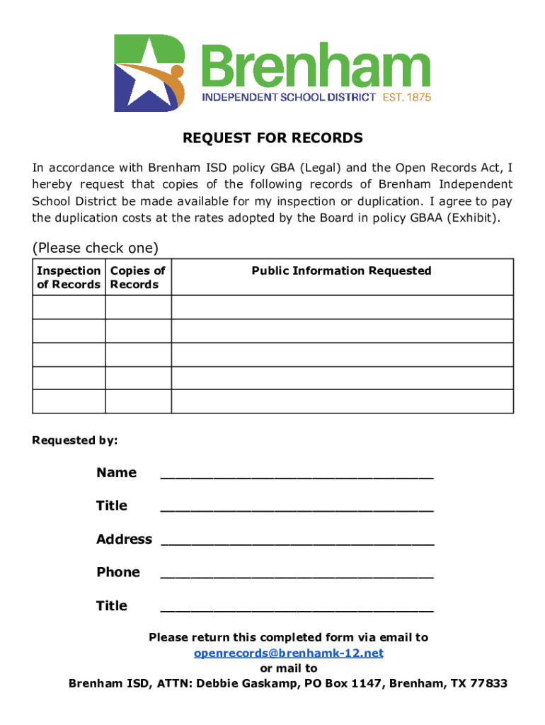 REQUEST FOR RECORDS In accordance with Blenheim ISD policy GBA (Legal) and the Open Records Act, I hereby request that copies of the following records of Blenheim Independent School District be made