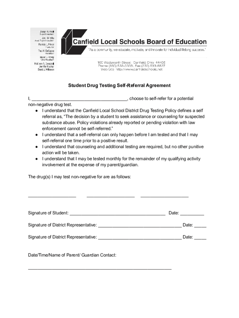 Student Drug Testing SelfReferral Agreement I, choose to self refer for a potential nonnegative drug test. I understand that the Canfield Local School District Drug Testing Policy defines a self referral