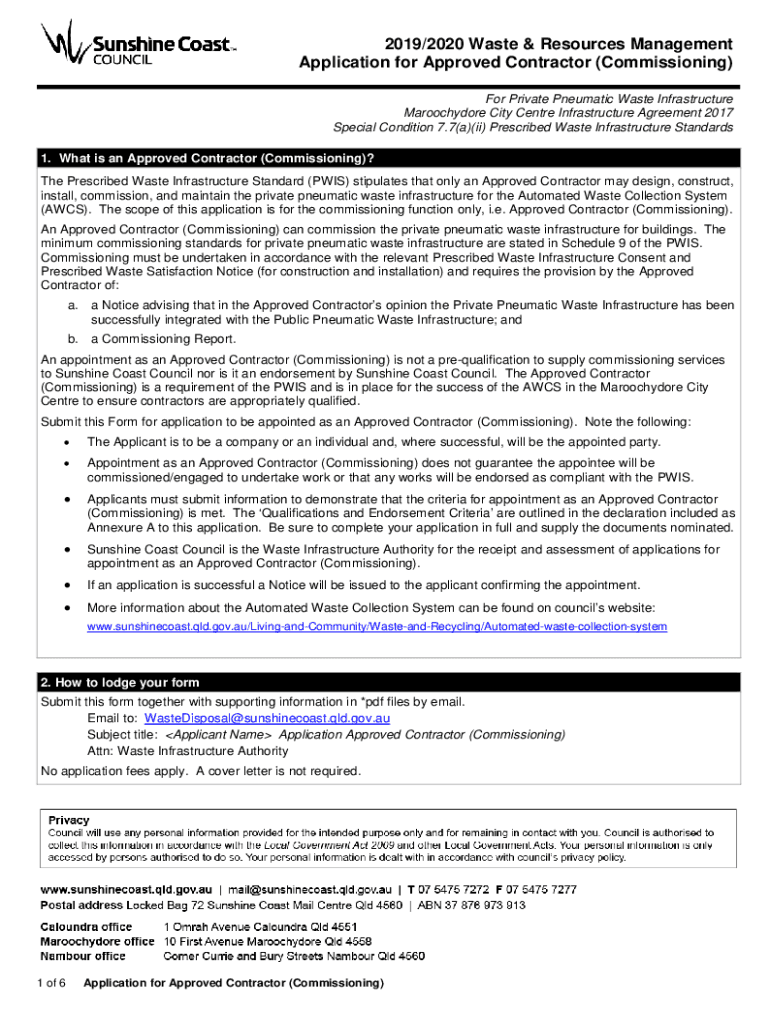 2019/2020 Waste & Resources Management Application for Approved Contractor (Commissioning) For Private Pneumatic Waste Infrastructure Maroochydore City Center Infrastructure Agreement 2017 Special