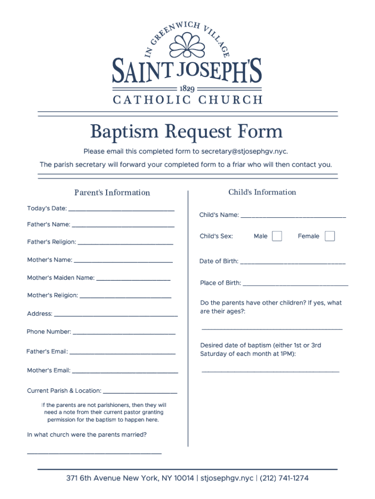 Baptism Request Form Please email this completed form to secretary stjosephgv.NYC. The parish secretary will forward your completed form to a friar who will then contact you. Parent's Information