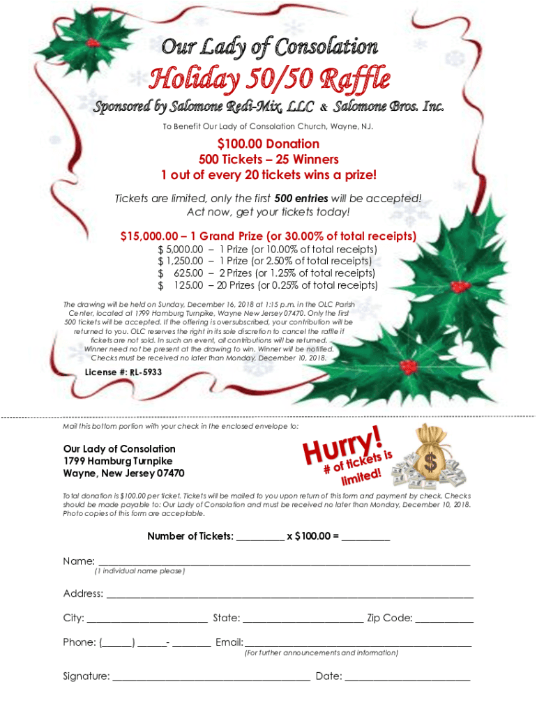 Our Lady of Consolation Holiday 50/50 Raffle Sponsored by Salomon Remix, LLC&Salomone Bros. Inc. To Benefit Our Lady of Consolation Church, Wayne, NJ.$100.00 Donation 500 Tickets 25 Winners 1 out