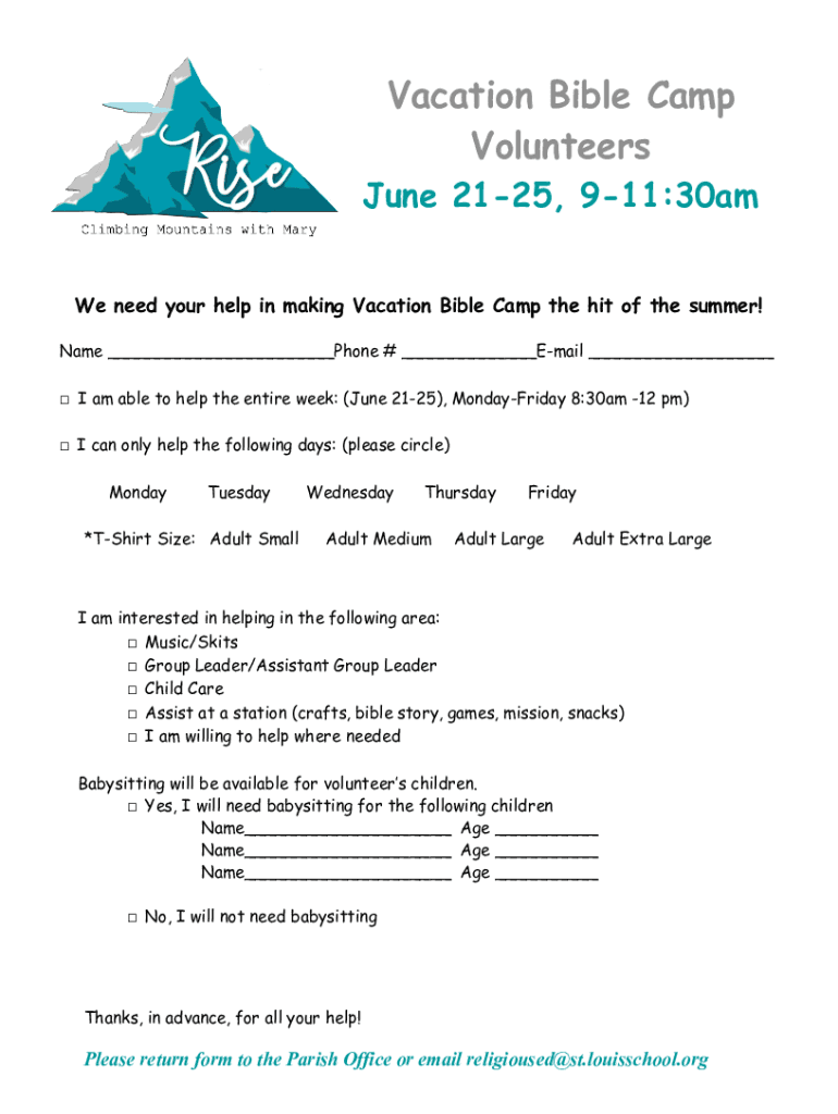 Vacation Bible Camp Volunteers June 2125, 911:30am We need your help in making Vacation Bible Camp the hit of the summer! Name Phone # Email I am able to help the entire week: (June 2125), Monday