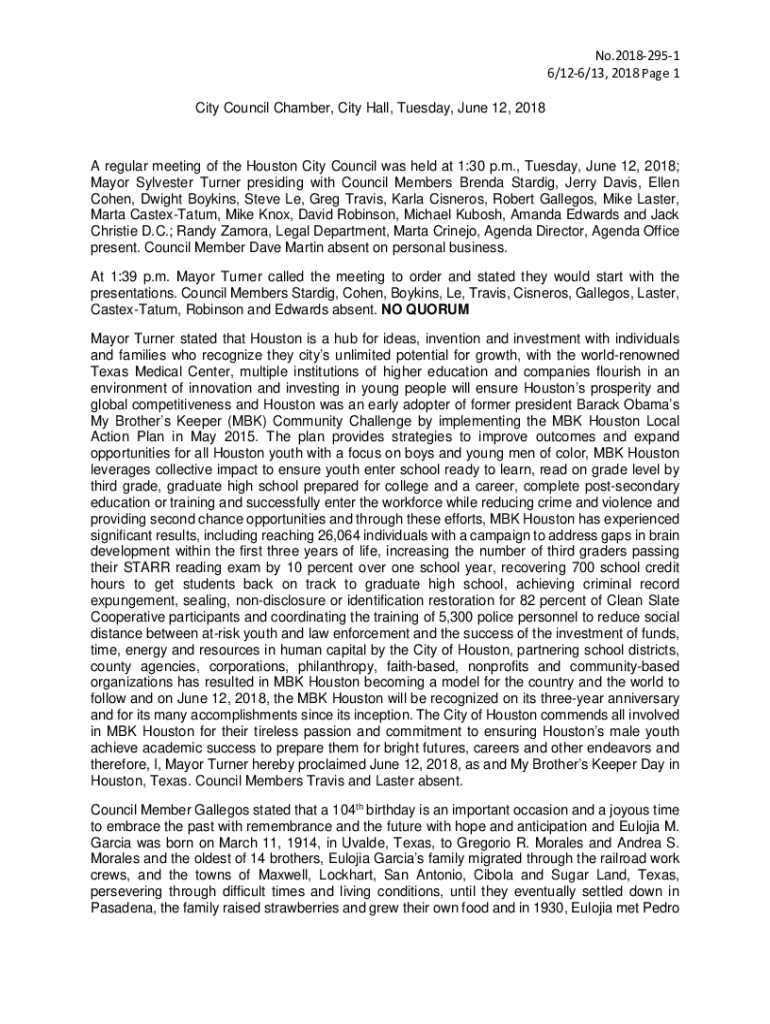 No.20182951 6/126/13, 2018-Page 1 City Council Chamber, City Hall, Tuesday, June 12, 2018A regular meeting of the Houston City Council was held at 1:30 p.m., Tuesday, June 12, 2018; Mayor Sylvester