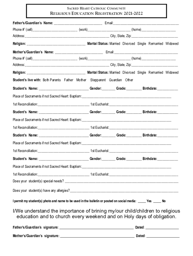 SACRED HEART CATHOLIC COMMUNITY RELIGIOUS EDUCATION REGISTRATION 20212022Fathers/Guardians Name: Email: Phone # (cell) (work) (home) Address: City, State, Zip: Religion: Marital Status: Married Divorced