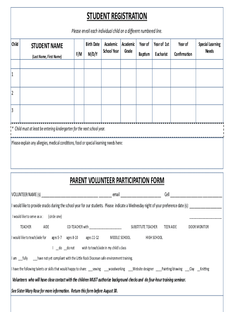 STUDENT REGISTRATION Please enroll each individual child on a different numbered line. Childbirth DateSTUDENT NAME F/M(Last Name, First Name’M/D/Academic School Year Graveyard year of 1stYear ofBaptismEucharistConfirmationSpecial