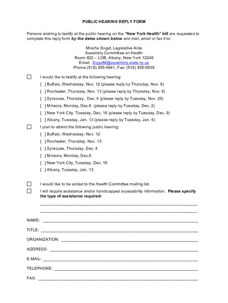 PUBLIC HEARING REPLY FORM Persons wishing to testify at the public hearing on the New York Health bill are requested to complete this reply form by the dates shown below and mail, email or fax it