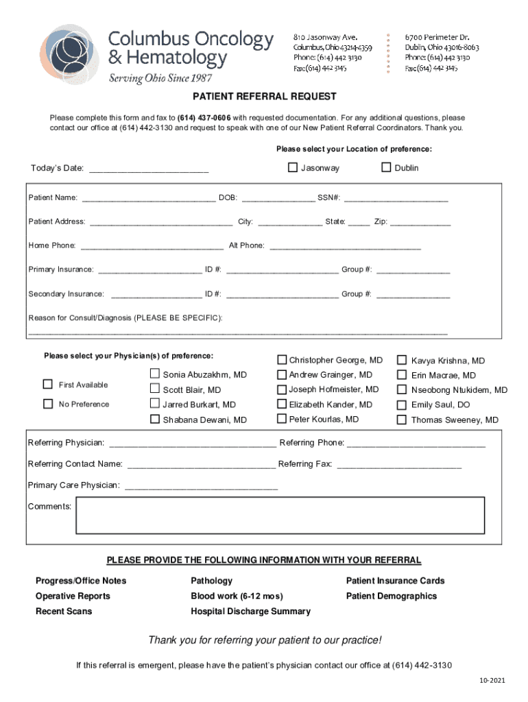 Get the free Patient Referral Request Form - Columbus Oncology
