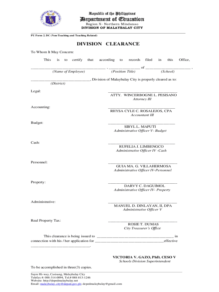 Republic of the PhilippinesDepartment of Education Region X Northern Mindanao DIVISION OF MALAYALAM CITY PU Form 2. DC (Teaching and Teaching Related)DIVISION CLEARANCE To Whom It May Concern: ThisistocertifythataccordingtorecordsfiledinthisOffice,