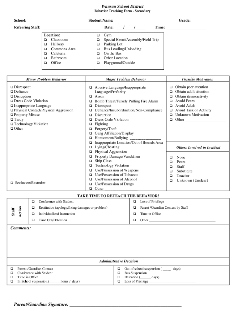 Wausau School District Behavior Tracking Form SecondarySchool: Student Name: Referring Staff: Location: Classroom Hallway Commons Area Cafeteria Bathroom OfficeMinor Problem Behaviorism: Gym Special